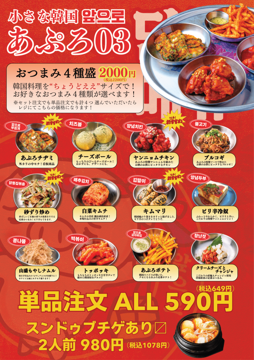 仕事帰りのサク飲みに向けて、チヂミやトッポギなどの韓国屋台メニューを600円台から提供し、おひとり様や少人数でも楽しめる小皿メニューやおつまみを拡充。